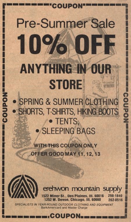 Erehwon Mountain Outfitter was a midwest outdoor clothing, gear, and equipment chain founded in 1972 and closed in 2018. The Des Plaines location was at 1522 Miner Street.